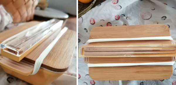 天然木のお箸は塗装がされているので、食器用洗剤で洗え、シンプルなスクエア型なので水切れがよく乾きが速い印象でした。この箸セットは薄くてコンパクトなので、同じシリーズのお弁当箱の上にピッタリ収まり、お弁当箱と一緒にランチクロスで包めます。