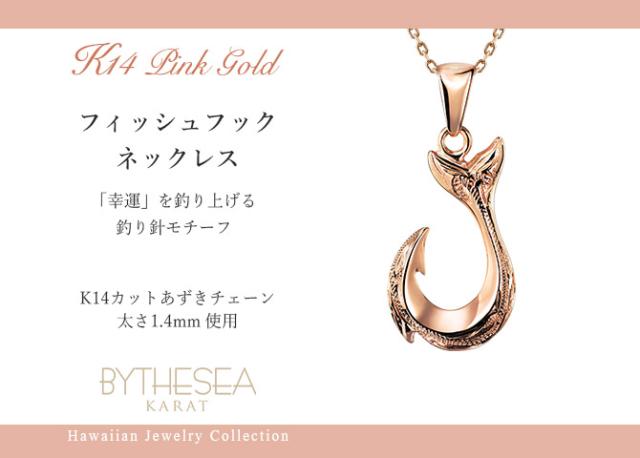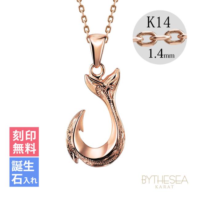 ゴールド ネックレス ハワイアンジュエリー フィッシュフック モアナ ピンクゴールド ネックレス 刻印 無料 誕生石入れ可 幸せを釣上げる 14k k14カットあずきチェーン太1.4mm 長さ ギフトラッピング可能 プレゼント ホワイトデー 卒業式 入学式 【品番:CG-GP113R-CH1020】