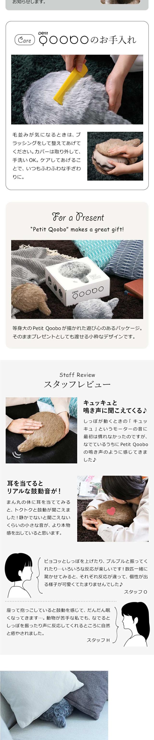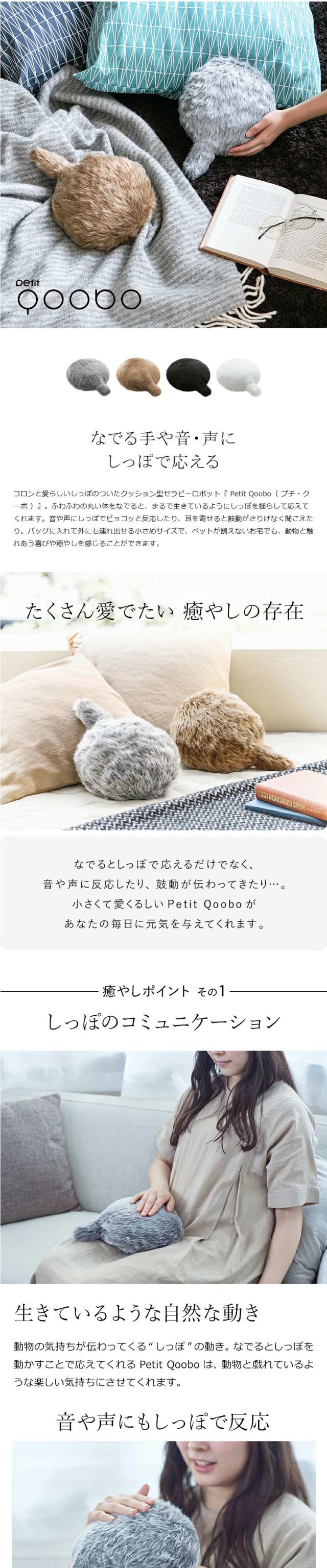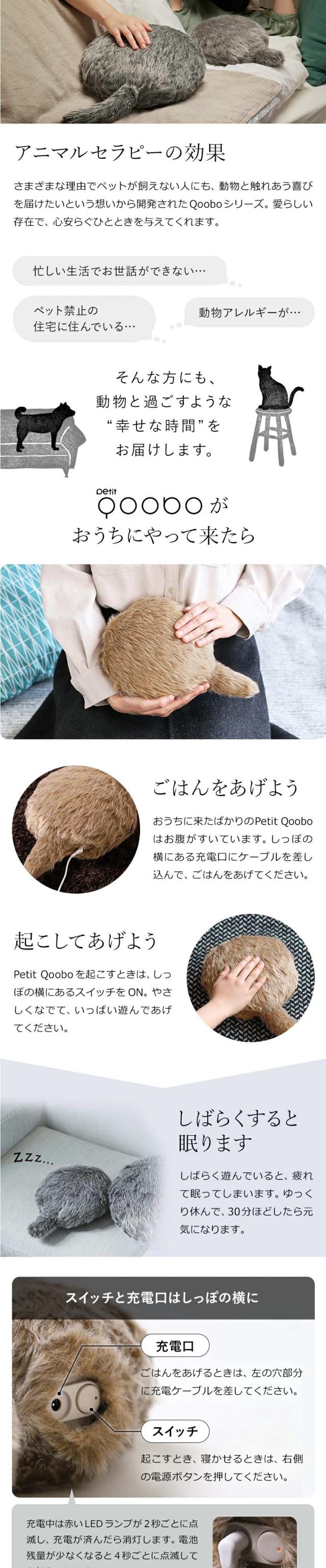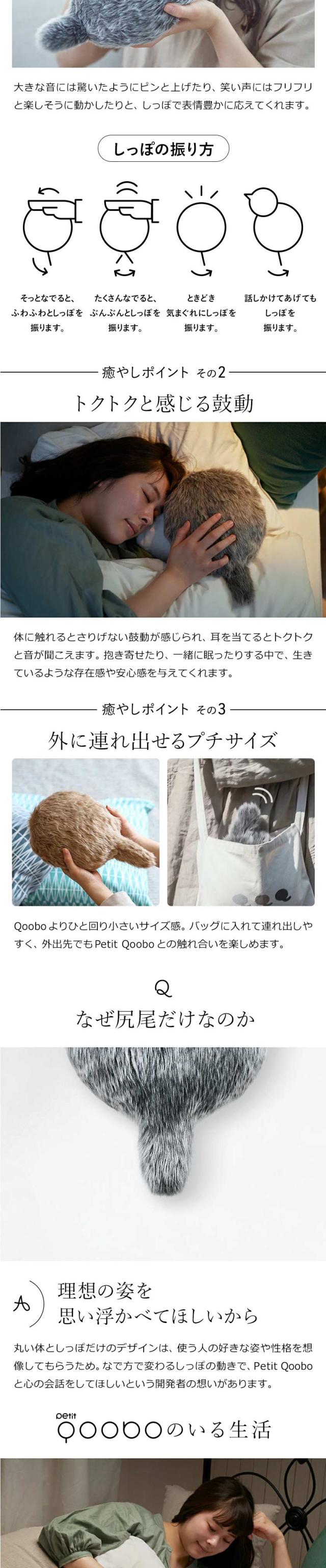 コロンと愛らしいしっぽのついたクッション型セラピーロボット『 Petit Qoobo( プチ・クーボ )』。ペット型ロボット プチクーボは ふわふわの丸い体をなでると、ロボットペットですがまるで動物(アニマル)のようにしっぽを揺らして応えてくれます。猫アレルギー、犬アレルギー( 動物アレルギー )の方にも安心、保育園や幼稚園、学童保育、介護施設、老人ホームなど施設で使うものいいですね。子供から高齢者の方まで癒す存在の可愛い小型ロボット「 Petit Qoobo 」で、おうち時間を楽しく過ごしませんか。