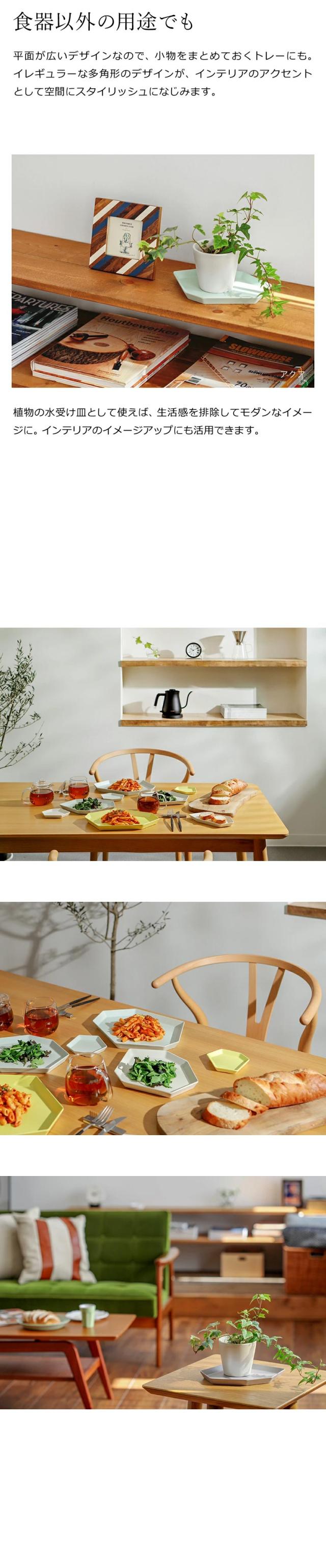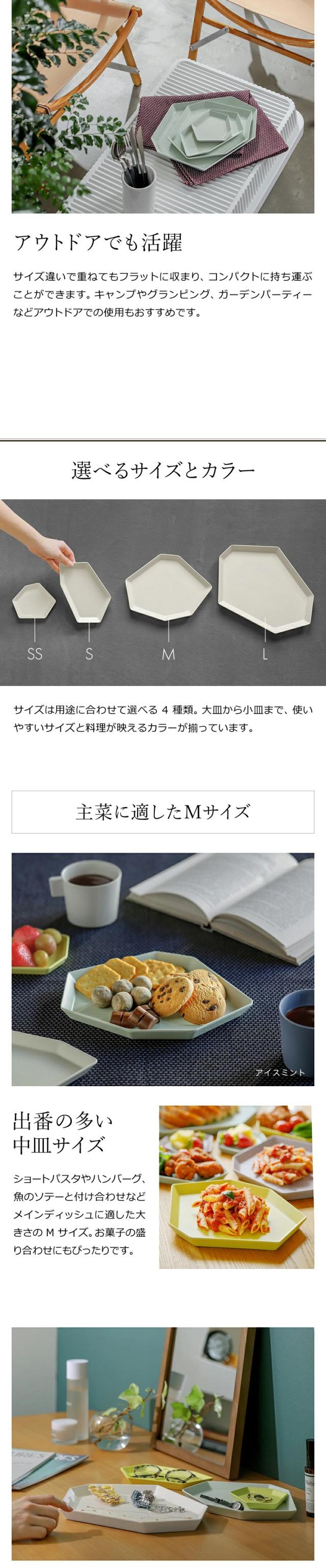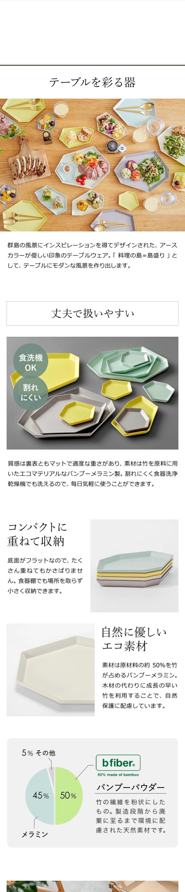 群島の風景に着想を得てデザインされたテーブルウェア『 ideaco Shimamori( イデアコ シマモリ )M 』。素材の約50%が竹で作られたエコマテリアルで、割れに強く食洗機対応。載せる料理の和洋を問わず、メインディッシュにちょうどいい大きさです。カップと料理を載せてカフェトレーとして使うのも◎。環境にやさしく、サスティナブルなバンブーメラミンの素材です。サイズ違いでスタッキングしてもコンパクトに収納でき、キャンプなどのアウトドアでも活躍します。内祝いや結婚祝いなどのギフトにも喜ばれています。
