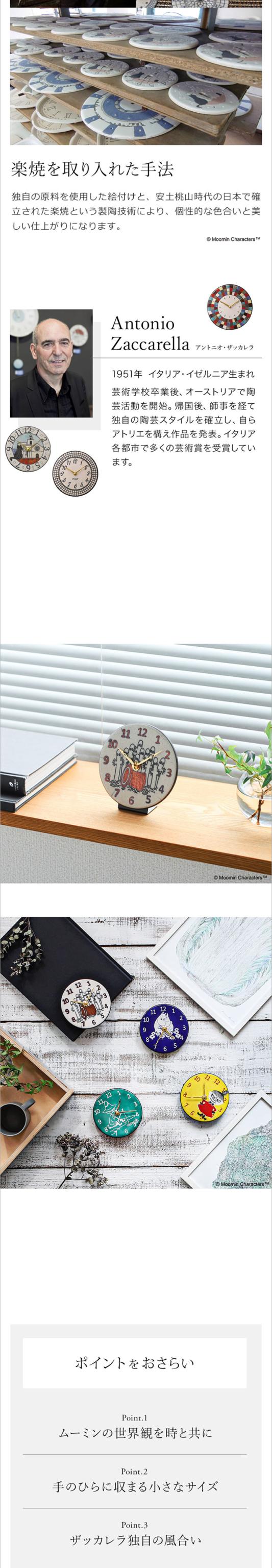ムーミンの人気キャラクターたちが文字盤を彩る『 ムーミン×ザッカレラ 陶器時計 』。陶製の文字盤はイタリアの陶芸家、アントニオ・ザッカレラ独自の製陶技術によるハンドメイド。優れた技術とアート感覚が注ぎこまれたオブジェとしての存在感も楽しめます。入学・就職・引っ越しなど新生活ギフトや、ムーミンファンの方や大切な方への贈り物にもおすすめです。