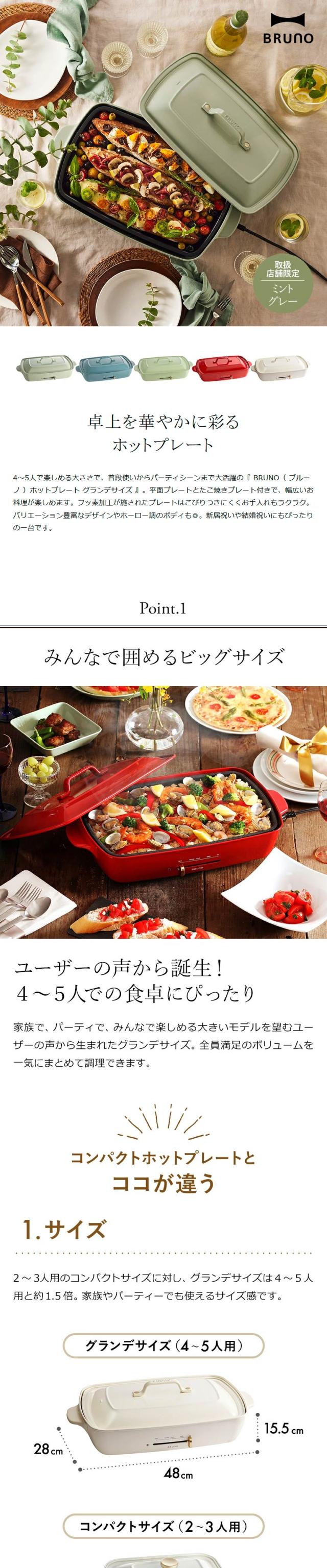 鮮やかなカラーリングにホーロー調の艶やかボディが人気の「 BRUNO コンパクトホットプレート 」に、ひと回り大きくなった『 ホットプレート グランデサイズ 』 が仲間入り。以前は2〜3人用でしたが、グランデサイズは4〜5人で楽しめるサイズ感。普段使いだけでなく、お友達やご両親などが集まるパーティシーンでも大活躍してくれますよ。