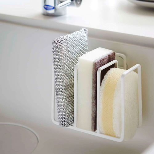 キッチンのスポンジを3つ収納できるスポンジホルダー。シンクのフチに吸盤で簡単に取り付けられます。 キッチンの流し台だけでなくバスルームなどサニタリーでも使用可能。