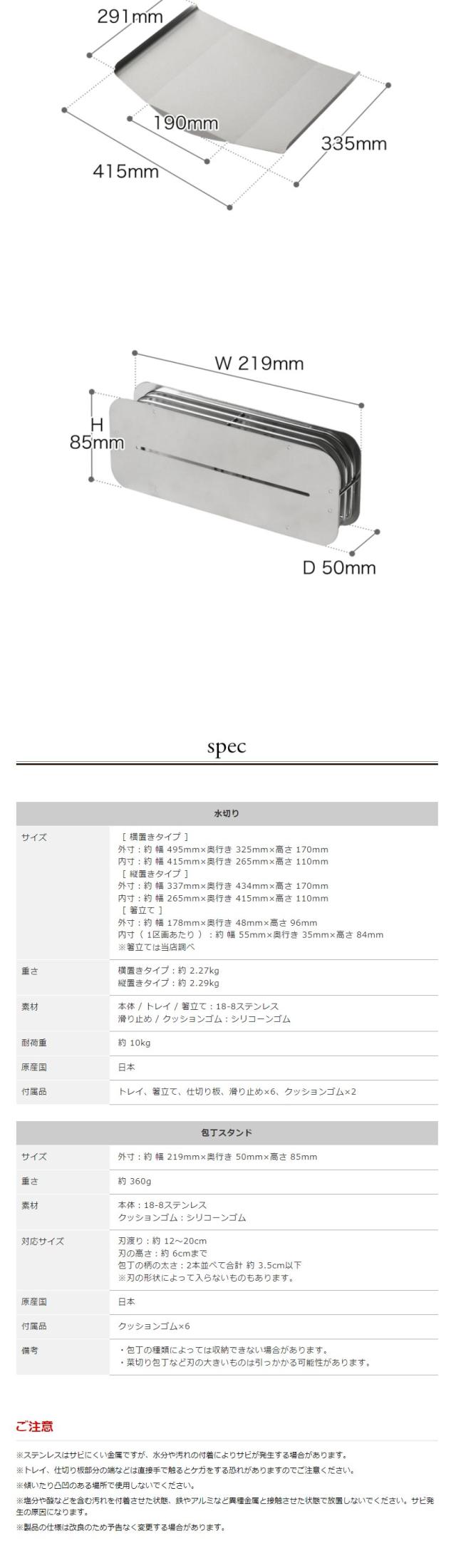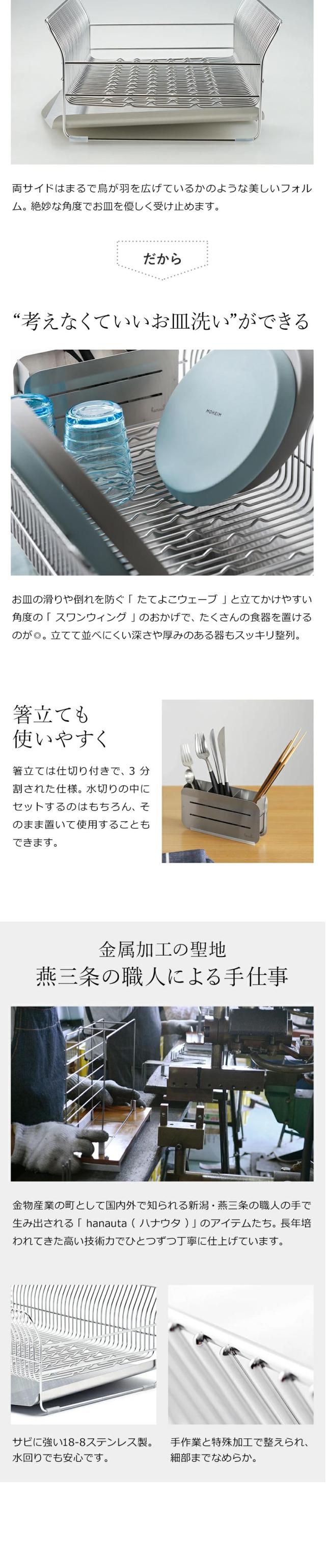 お皿をしっかり支えるはなうたの水切り。お椀や小鍋、フライパン、まな板などもバッチリ。包丁を収納できる包丁スタンド付き。サビに強い18-8ステンレス製。燕三条産の日本製です。