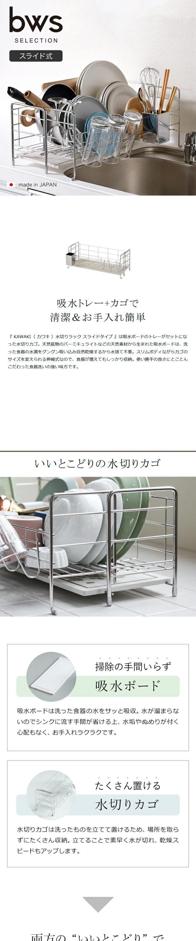 『 KAWAKI( カワキ )水切りラック スライドタイプ 』は吸水ボードのトレーがセットになった水切りカゴ。天然鉱物のバーミキュライトなどの天然素材から生まれた吸水ボードは、洗った食器の水滴をグングン吸い込み自然乾燥するから水捨て不要。スリムボディながらカゴのサイズを変えられる伸縮式なので、食器が増えてもしっかり収納。使い勝手の良さにとことんこだわった食器洗いの強い味方です。 bws SELECTION( ビーワース セレクション )の商品です。
