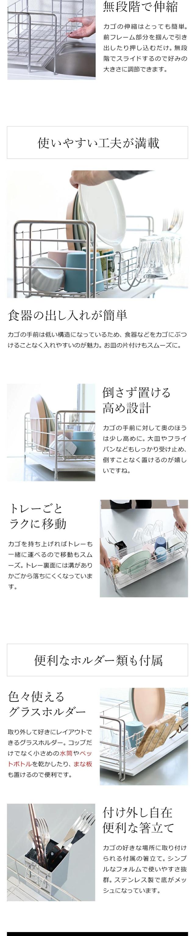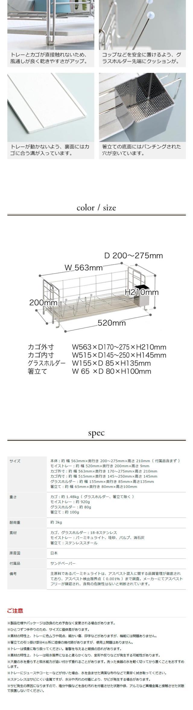 モイス 吸水トレー がセットになった燕三条 ステンレス製水切りカゴ。珪藻土などの天然素材トレーで水を吸水。カゴのサイズを変えられるスライド伸縮式。日本製