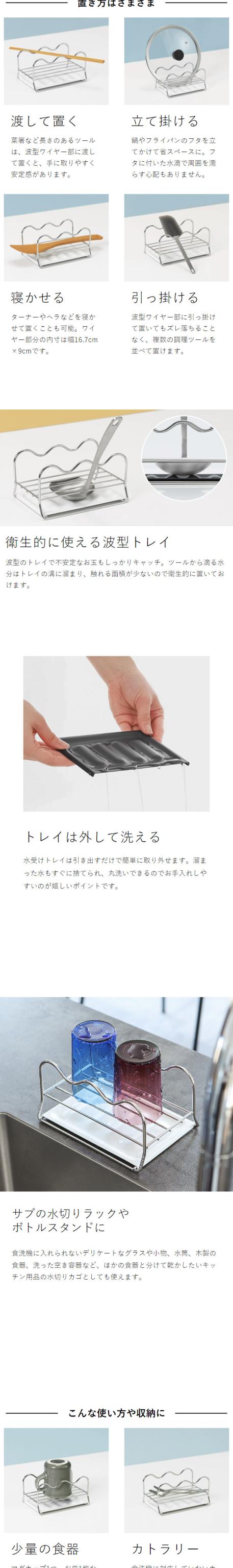 調理中のキッチンツールやお鍋のフタなどの一時置きができる『 UtaU キッチンマルチスタンド 』。波型ワイヤーでお玉や菜箸が転がりにくく、立て掛け・引っ掛け・横置きなど、様々な置き方ができます。複数のツールをまとめて収納でき、キッチンツールスタンドやお玉&鍋蓋スタンドとしても◎。コンパクトでキッチン周りにすっきり収まり、グラス用のサブ水切りラックや、マグボトルなどを干すボトルスタンドなど、シンク周りでも重宝します。
