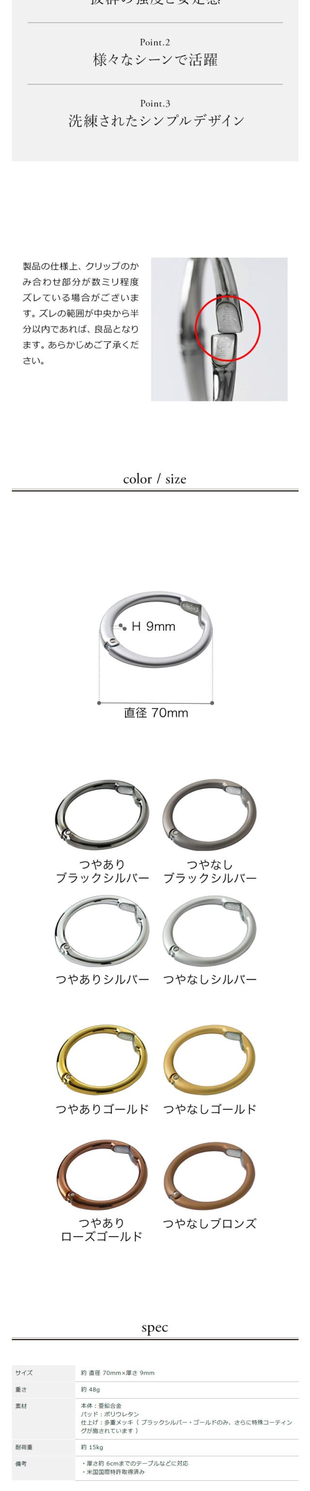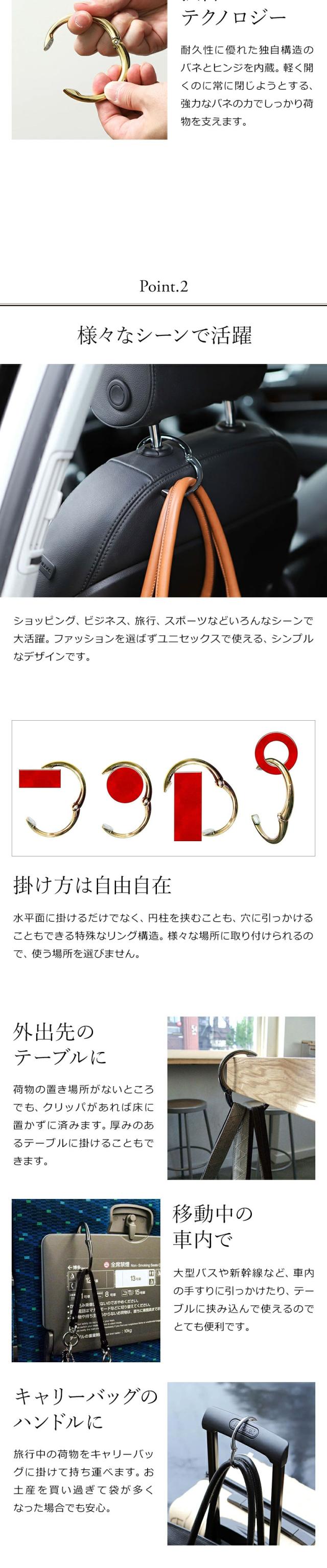 鞄などの置き場所がない時に便利なリング状のバッグハンガー。耐荷重15kgで荷物をしっかり支える便利グッズです。おしゃれなアクセサリーのようなデザインでビジネスシーンにもおすすめ。