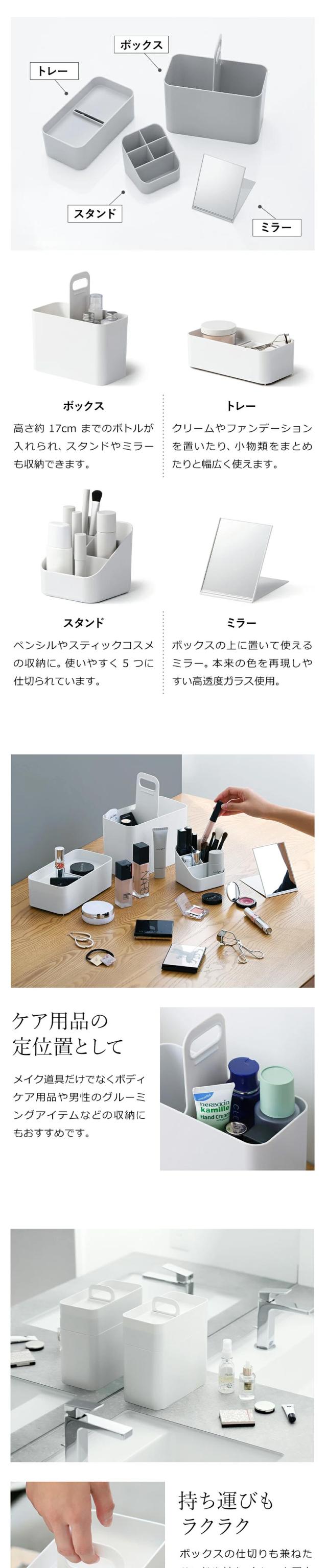 メイク道具や化粧品をまとめて収納できます。高さ約17cmまでのボトルが入るボックス、ブラシ類が入るスタンド、小物を置けるトレー付きです。取っ手付きで持ち運びやすいのも◎。