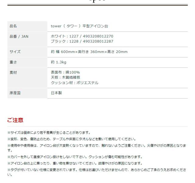 [ 平型アイロン台 タワー ]山崎実業 tower アイロン台 コンパクト 平型 yamazaki おしゃれ ミニ 60×36cm 白 黒 ホワイト ブラック 山崎 平型アイロン台 デスク テーブル アイロン掛け シンプル 綿 四角 人気 おすすめ 1227 1228【送料無料】