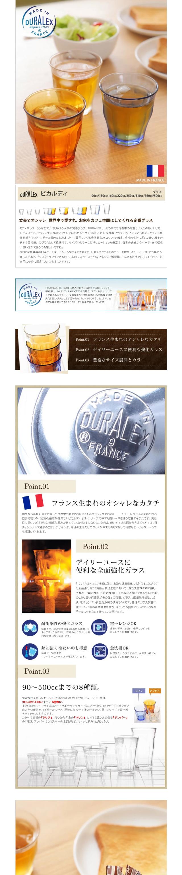 カフェやレストランなどでよく見かける人気の定番グラス「 DURALEX 」。その中でも定番中の定番といえるのが、『 ピカルディ 』です。フランス生まれのシンプルで味のあるデザインはもとより、全面強化ガラスという丈夫さも魅力。 グラスに直接熱湯を注いだり、ガラス器のまま冷凍したり、電子レンジも食洗機もOKなタフさを備え、現代の生活に即した使い勝手の良さは普段使いのグラスとして最適です。