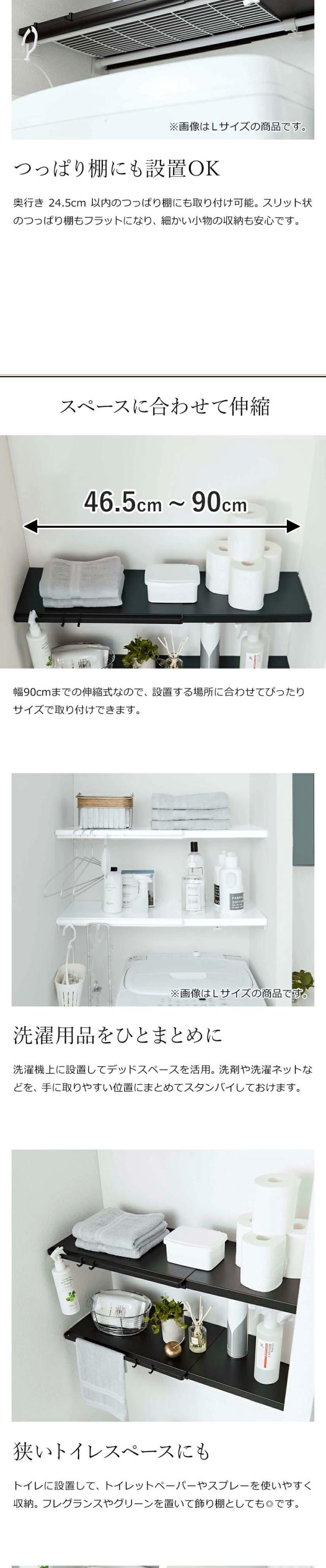 お手持ちのつっぱり棒やつっぱり棚に載せて収納スペースが作れる棚板。伸縮式なので設置場所に合わせて設置できます。シンプルなデザインで、サニタリーやトイレなどにぴったり。