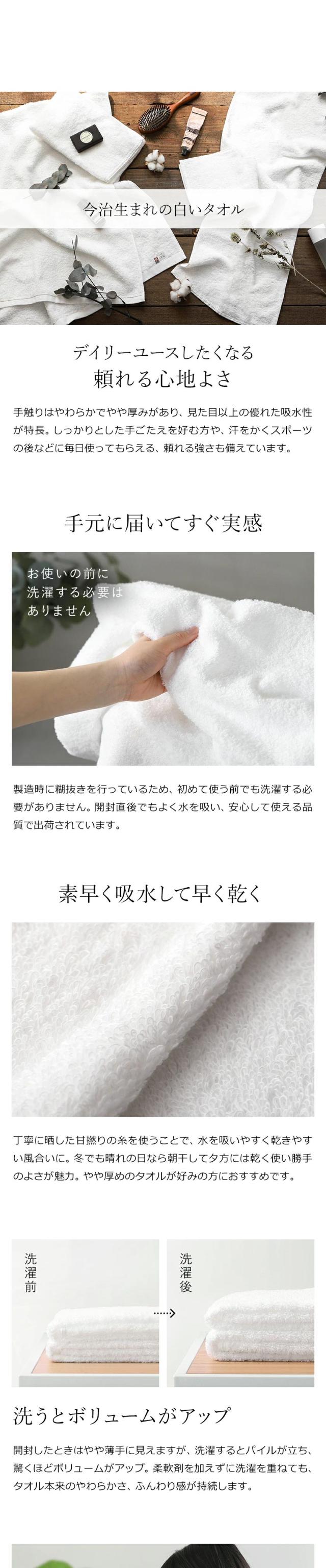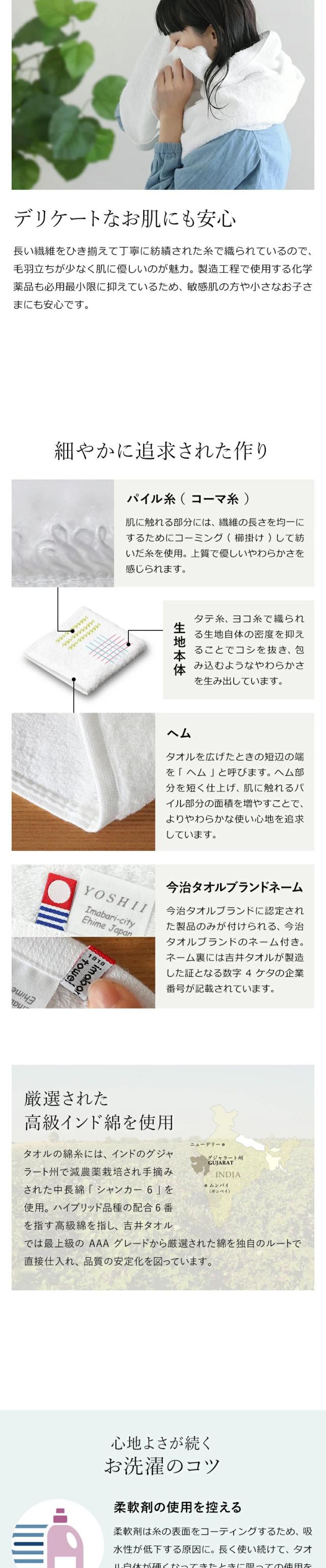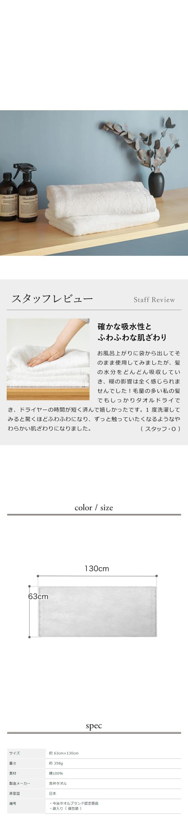 綿本来の白さと柔らかさを引き出した上質な今治タオル。高い吸水性とふんわりとした触り心地で、普段使いにおすすめ。日本製で安心して使用できるバスタオルです。