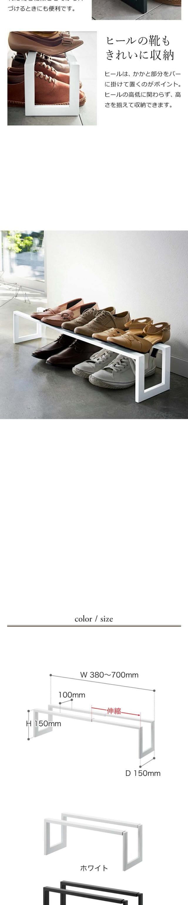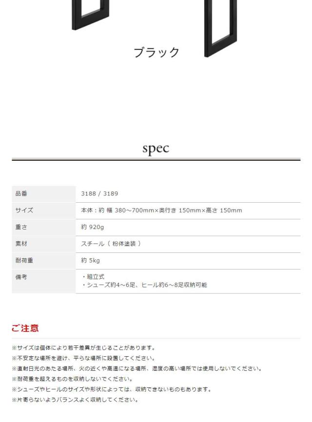 置く場所に合わせて横幅が変えられる伸縮式。男性のシューズは約6足、ヒールは約8足が収納可能。太めのスチールを使用したシンプルなデザインはどんな玄関にもしっくり収まります。
