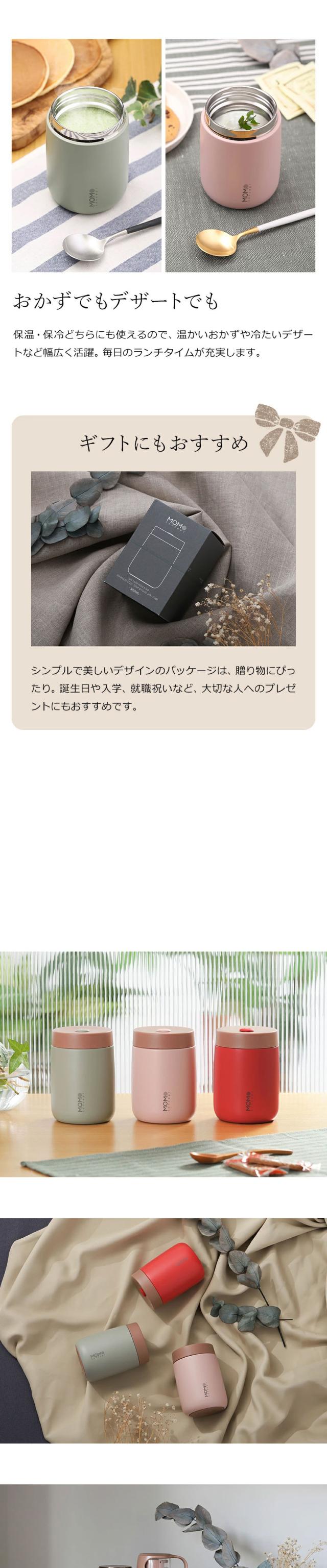 ニュアンスカラーでファッショナブル。コンパクトで軽量ながら、容量は360mLと満足サイズ。保温・保冷に優れた真空二重構造で、温かいスープや冷たいデザートの温度をキープします。