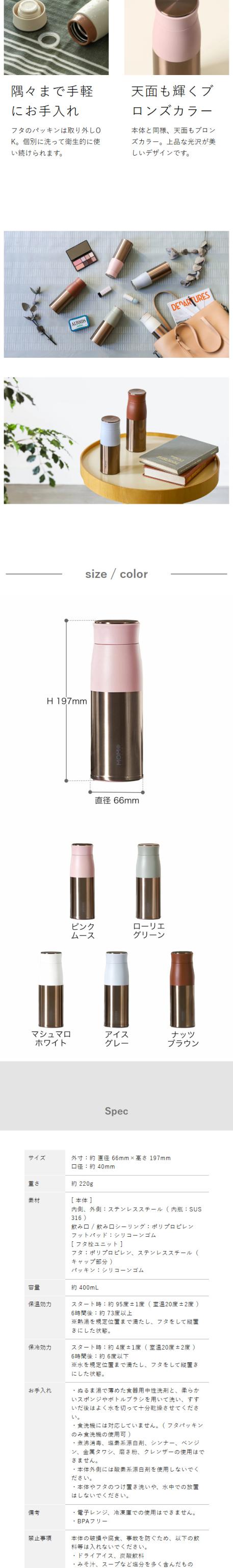 大人可愛いマイボトルがファッションのアクセントに ニュアンス&ブロンズカラーの組み合わせが美しい水筒『 ルピナスタンブラー 400mL 』。保温・保冷に優れた真空二重構造のステンレスボトルで、飲み物の適温を保ちます。約220gと軽量で、フタを外してすぐ飲める直飲みタイプ。なめらかな飲み口や静かに置ける底面の滑り止めなど、細かい気配りも◎。握りやすく、バッグから出し入れしやすいスリムなフォルムで、通勤や通学のフォトジェニックなマイボトルとして活躍します。