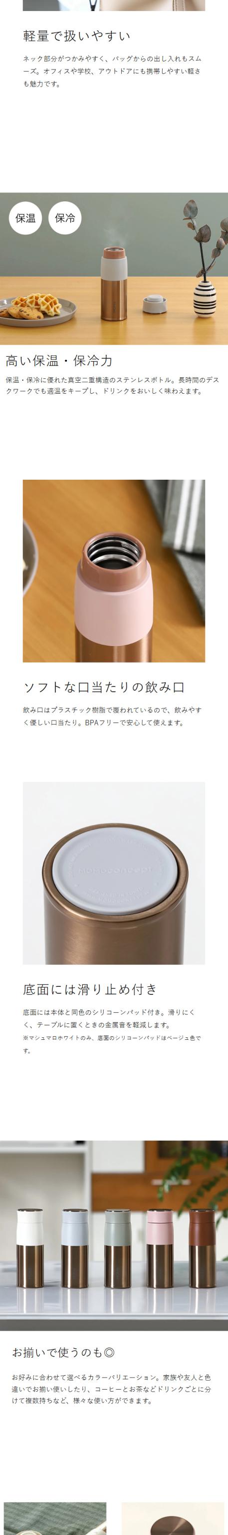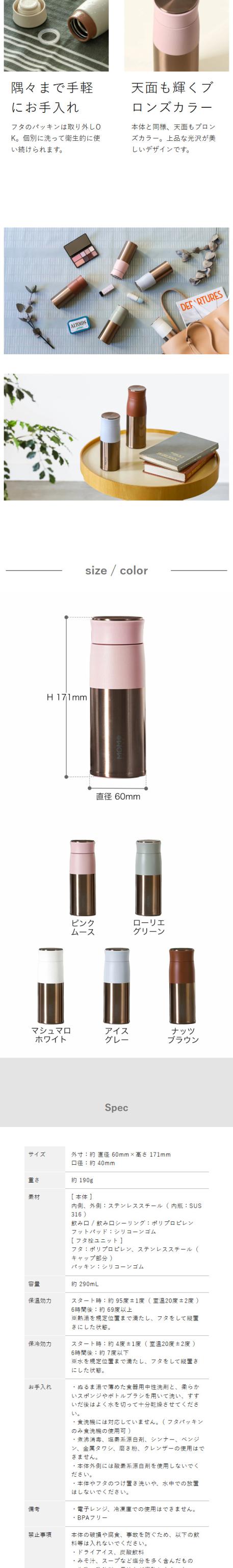 ファッショナブルに持ち歩き暮らしを彩るマイボトル ニュアンス&ブロンズカラーの組み合わせが美しい水筒『 ルピナスタンブラー 290mL 』。保温・保冷に優れた真空二重構造のステンレスボトルで、飲み物の適温を保ちます。約190gと軽量で、フタを外してすぐ飲める直飲みタイプ。なめらかな飲み口や静かに置ける底面の滑り止めなど、細かい気配りも◎。握りやすく、バッグから出し入れしやすいスリムなフォルムで、通勤や通学のフォトジェニックなマイボトルとして活躍します。