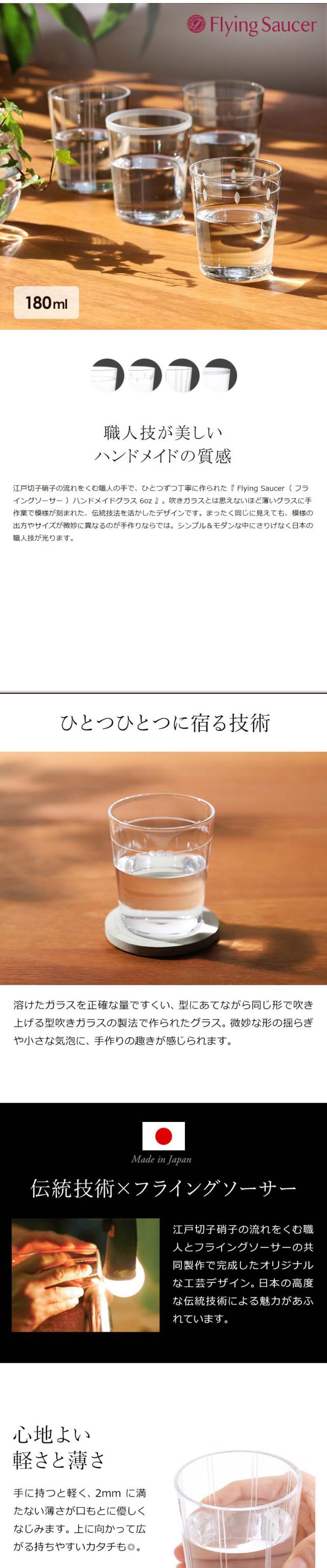 江戸切子硝子の流れをくむ職人の手で、ひとつずつ丁寧に作られた『 Flying Saucer( フライングソーサー )ハンドメイドグラス 6oz 』。吹きガラスとは思えないほど薄いグラスに手作業で模様が刻まれた、伝統技法を活かしたデザインです。まったく同じに見えても、模様の出方やサイズが微妙に異なるのが手作りならでは。シンプル&モダンな中にさりげなく日本の職人技が光ります。