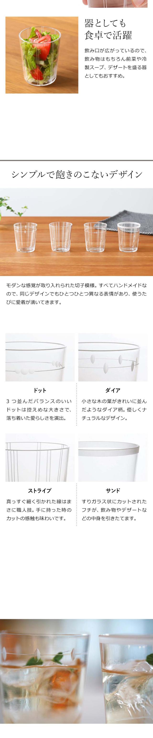 吹きガラスとは思えないほど薄いグラスに手作業で模様が刻まれた、伝統技法を活かしたデザインです。シンプル&モダンな中にさりげなく日本の職人技が光ります。