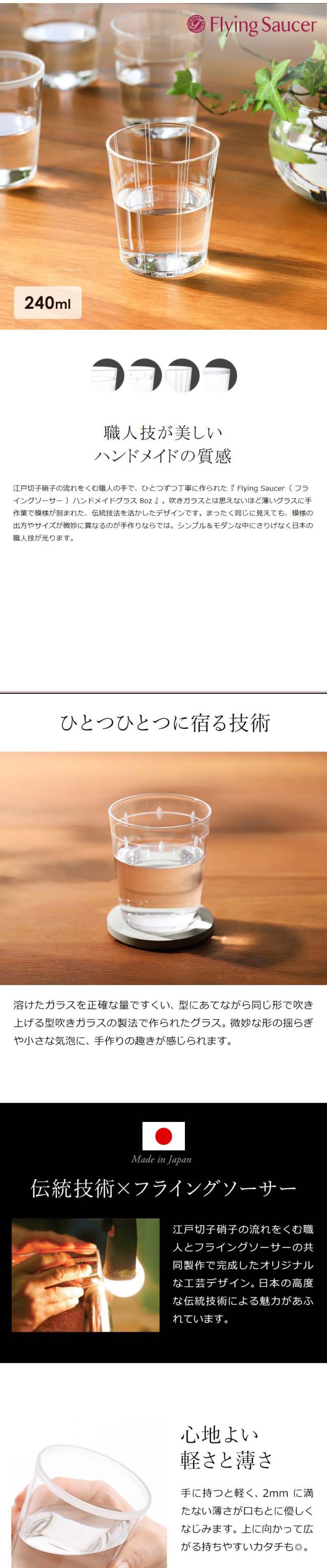 江戸切子硝子の流れをくむ職人の手で、ひとつずつ丁寧に作られた『 Flying Saucer( フライングソーサー )ハンドメイドグラス 8oz 』。吹きガラスとは思えないほど薄いグラスに手作業で模様が刻まれた、伝統技法を活かしたデザインです。まったく同じに見えても、模様の出方やサイズが微妙に異なるのが手作りならでは。シンプル&モダンな中にさりげなく日本の職人技が光ります。