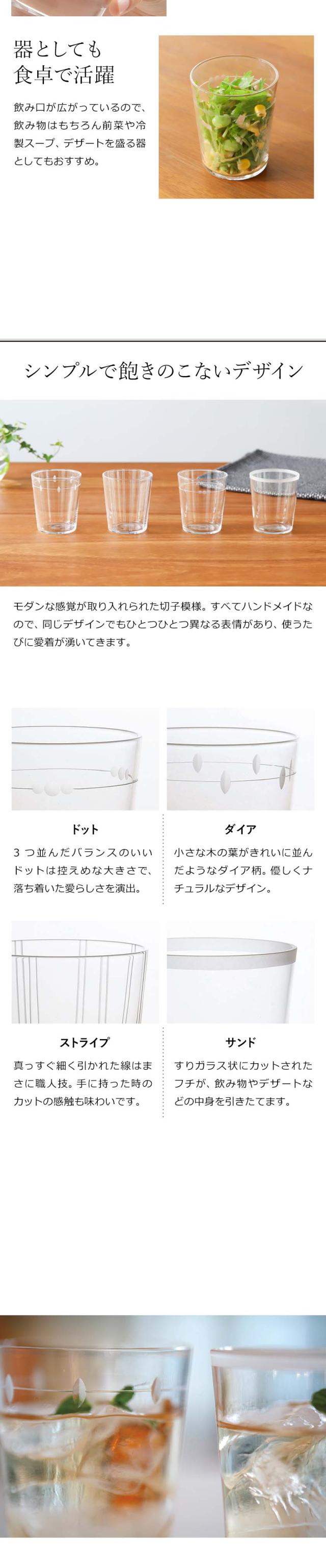 吹きガラスとは思えないほど薄いグラスに手作業で模様が刻まれた、伝統技法を活かしたデザインです。シンプル&モダンな中にさりげなく日本の職人技が光ります。