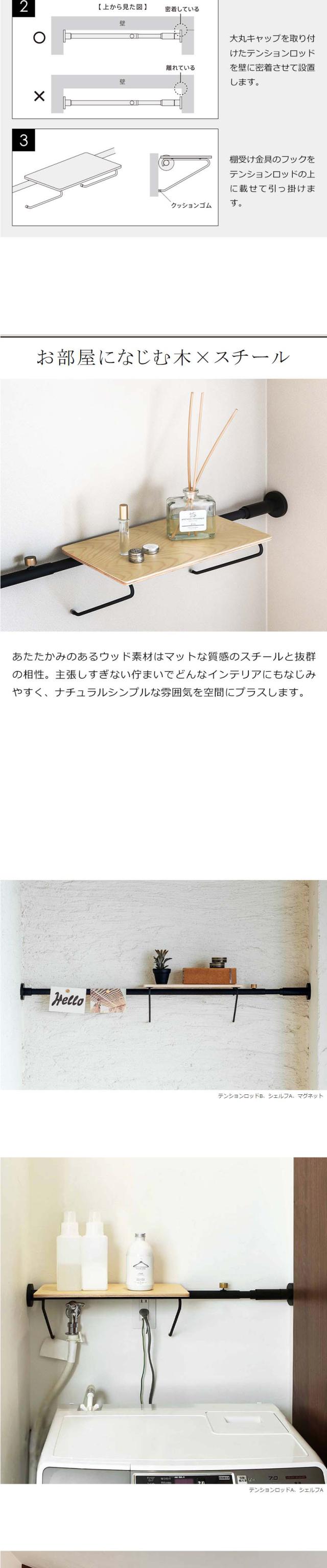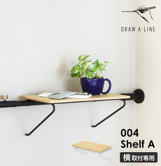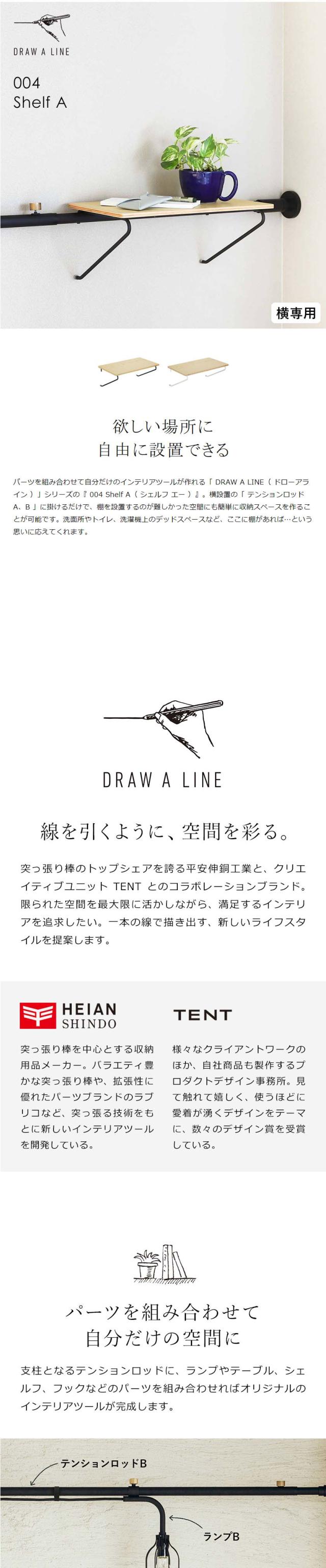 DRAW A LINE(ドローアライン)シリーズの『 004 Shelf A 』。横設置の「テンションロッドA、B」に対応。洗面所やトイレ、洗濯機上のデッドスペースなど簡単に収納スペースが作れます。