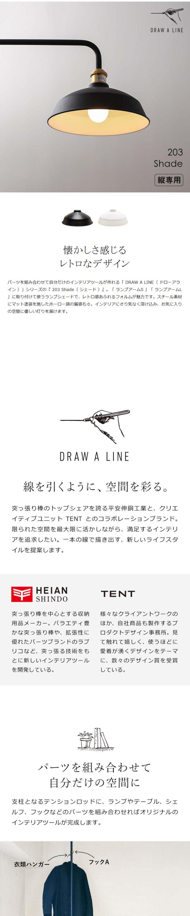 DRAW A LINE(ドローアライン)シリーズの『 203 Shade 』。「ランプアームS、L 」に取付け。レトロ感あふれるフォルムが魅力のランプシェードでお気に入りの空間に優しい灯りを届けます。