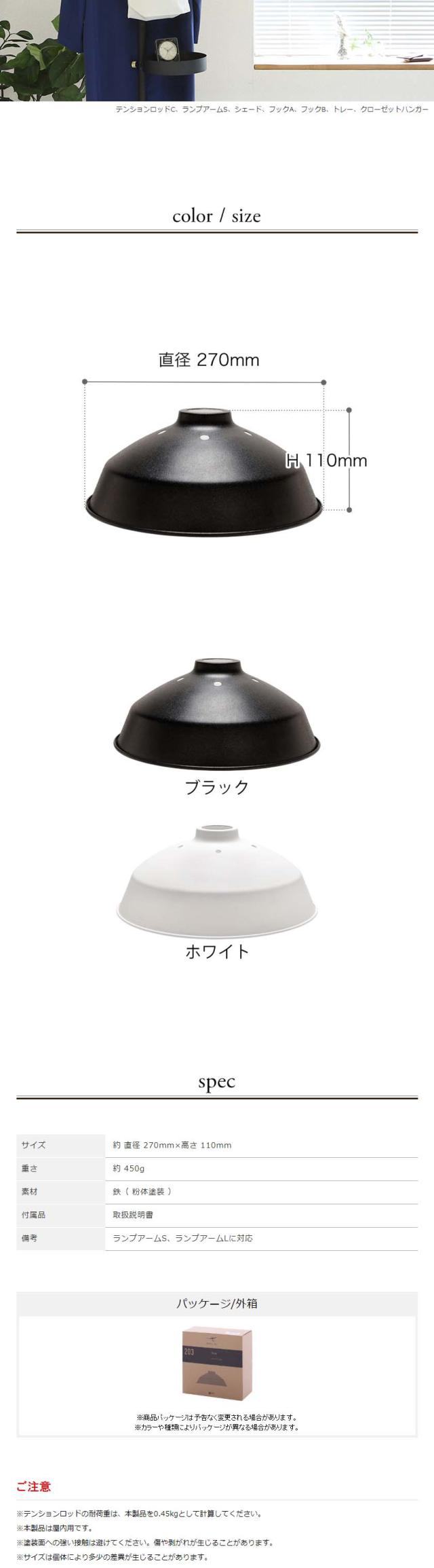 パーツを組み合わせて自分だけのインテリアツールが作れる「 DRAW A LINE( ドローアライン )」シリーズの『 203 Shade( シェード )』。「 ランプアームS 」「 ランプアームL 」に取り付けて使うランプシェードで、レトロ感あふれるフォルムが魅力です。スチール素材にマット塗装を施したホーロー調の質感も◎。インテリアにさり気なく溶け込み、お気に入りの空間に優しい灯りを届けます。