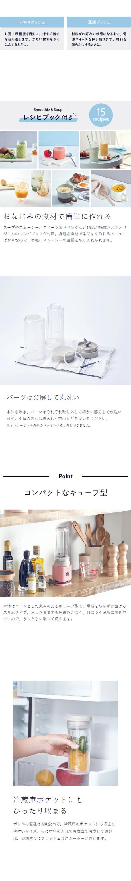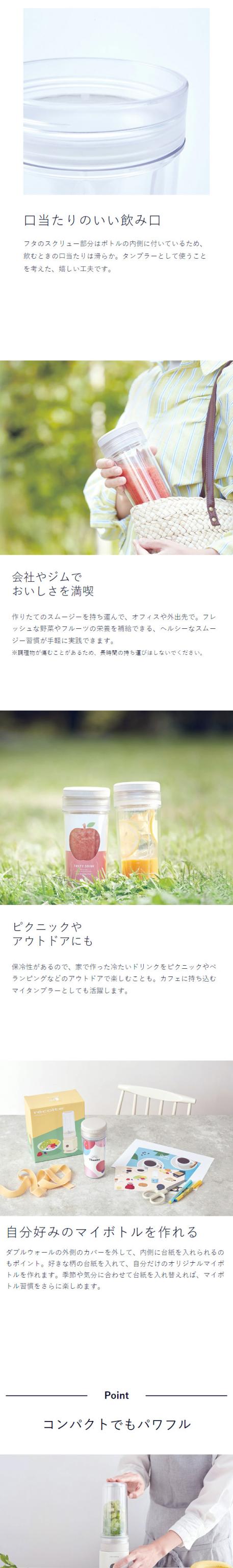 おしゃれな調理家電が人気のrecolteからスリムなブレンダーが登場。ブレンダーボトルは蓋付きタンブラーとして使えて持ち運びOK。保冷性があるダブルウォール構造で結露しにくいのが◎。