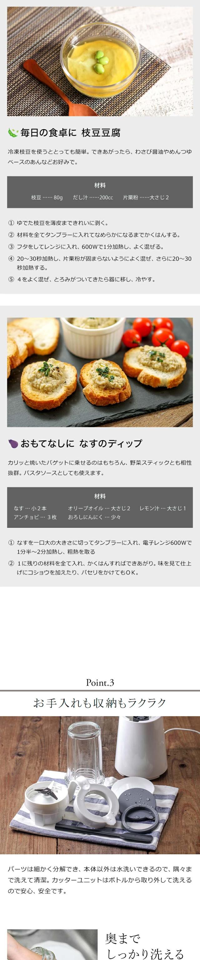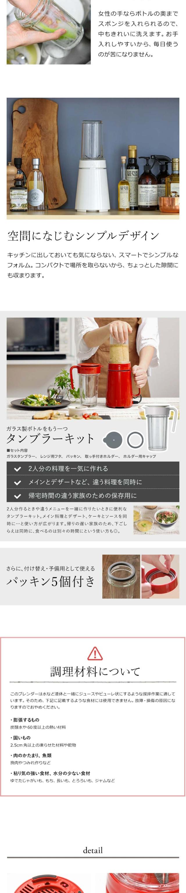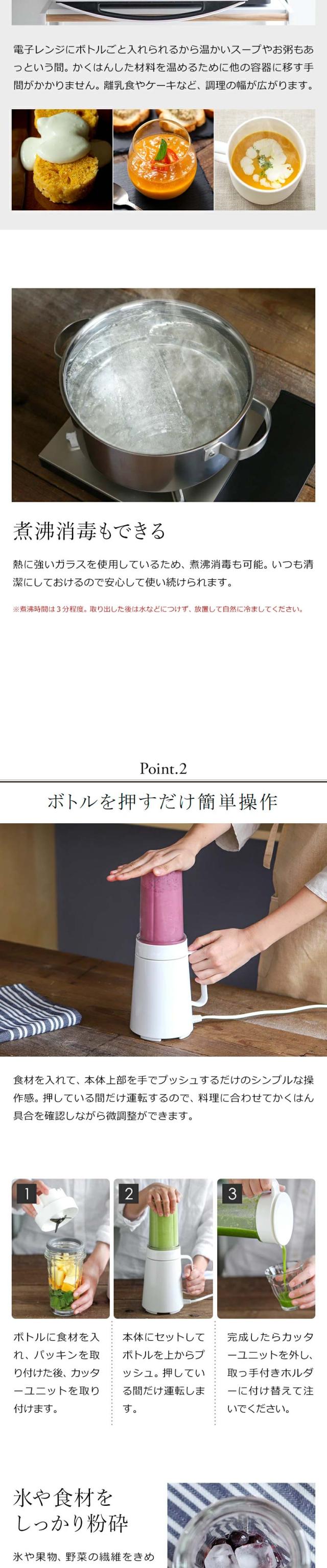 ボトルを上から押すだけで簡単に操作できる『 ±0 ( プラスマイナスゼロ )クッキングミキサー 』。ボトルは煮沸消毒もできる熱に強いガラスで、電子レンジにも対応。家庭の冷蔵庫で作った角氷も砕けるから、冷たいフラッペもおまかせです。容量400mlと使い勝手のいいサイズ感も◎。ジュースやデザートはもちろん、本格的なお料理まで作れるコンパクトで扱いやすい便利な一台です。小松菜とバナナのスムージー、ほうれん草にバナナとりんごを合わせたグリーンスムージー、りんごやキウイ、いちご、ブルーベリーなど使ってフルーツスムージーなど果物や野菜を気軽にとれる幅広いレシピが楽しめます。