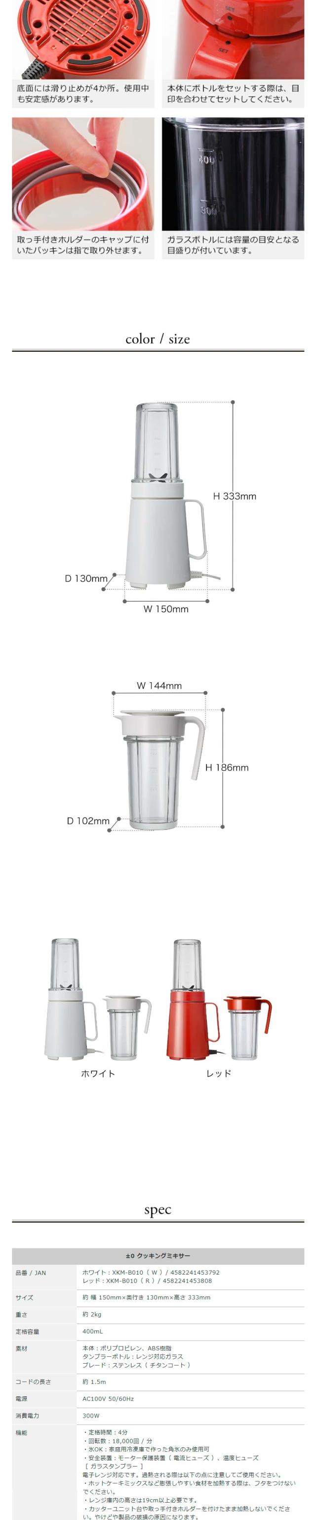 簡単に操作できる±0のクッキングミキサー。ボトルは耐熱性で電子レンジOK。ジュースはもちろん、本格料理や氷を砕いてフラッペも楽しめます。便利でコンパクトな扱いやすい一台です。