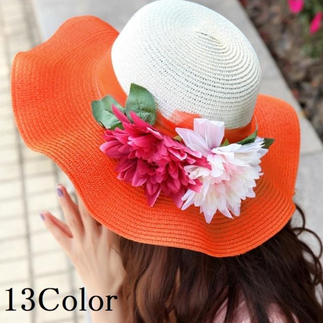 麦わら帽子 レディース ストローハット ぼうし 波型 リボン 花 フラワー 女性用 つば広 おしゃれ かわいい 日よけ 紫外線対