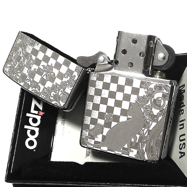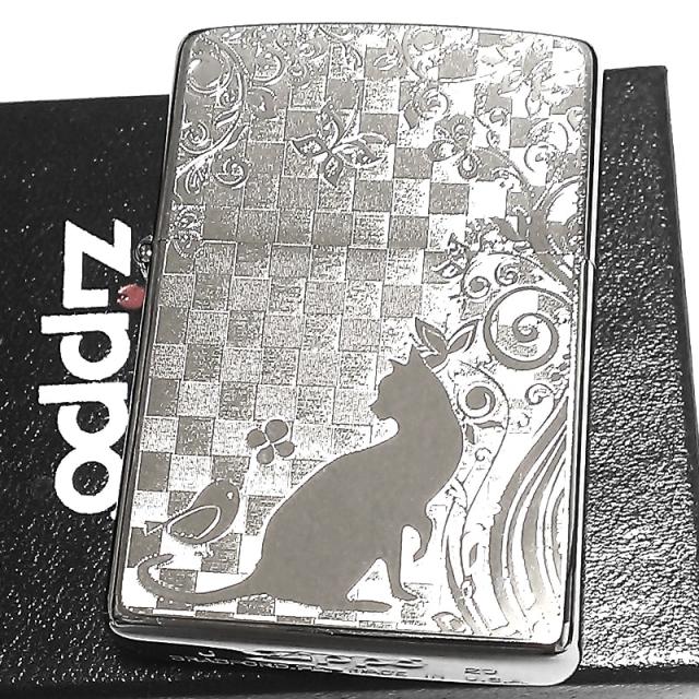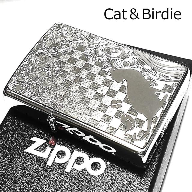 ZIPPO ライター ネコと小鳥 ジッポ 猫 細密エッチング かわいい 花畑 ユニーク ねこ 可愛い 女性 レディース メンズ ギフト プレゼント