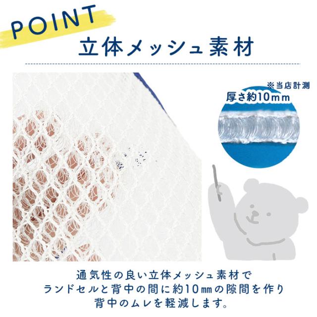 | 注意点 | ※ランドセルの種類によってはご使用できない場合がございます。ご了承ください。 ※メッシュ部分を直接素肌に当てて使用しないでください。 ※衣類によっては毛玉ができる場合があります。 ※本来の目的以外に使用しないでください。 ※洗濯機、アイロン及びドライヤー等は使用しないでください。 ※シンナーやベンジン等の有機溶剤は変色、色落ちの原因となりますので使用しないでください。 ※素材の特性上、雨や汗などで濡れた状態、または強くこすったりすると色移りや色落ちの可能性がありますので、ご注意ください。 ※火気の近くや高温多湿、直射日光の当たる場所に長時間放置、保管しないでください。 ※長期間使用しない場合は、水気を充分にふき取り、陰干しをしてから通気性のよい場所に保管してください。 ※カメラやモニターの性質により、画像と実物の色の違いがある場合がございますのでご理解願います。 |