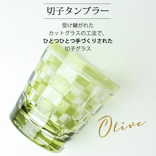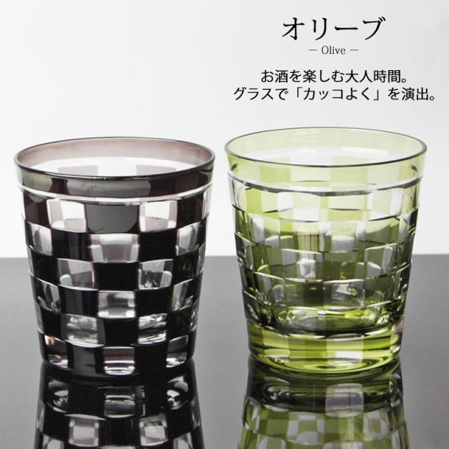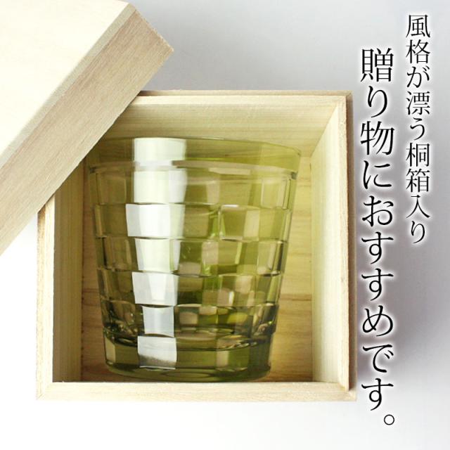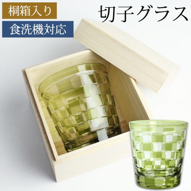 単品(1個) 桐箱入り切子グラス 260ml オリーブ 桐箱入り 市松模様 おしゃれ 切子 グラス タンブラー オールド 酒器 ビール 焼酎 日本酒 などに ガラス 食洗機対応