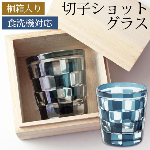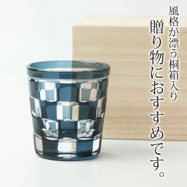 単品(1個) 桐箱入りショットグラス 切子グラス 65ml 市松模様 インクブルー 桐箱入り おしゃれ ぐい呑み お猪口 おちょこ 日本酒 ウイスキー リキュール テキーラ などに ガラス 青 食洗機対応 プレゼント ギフト 贈り物 コップ お祝い ギフトBOX