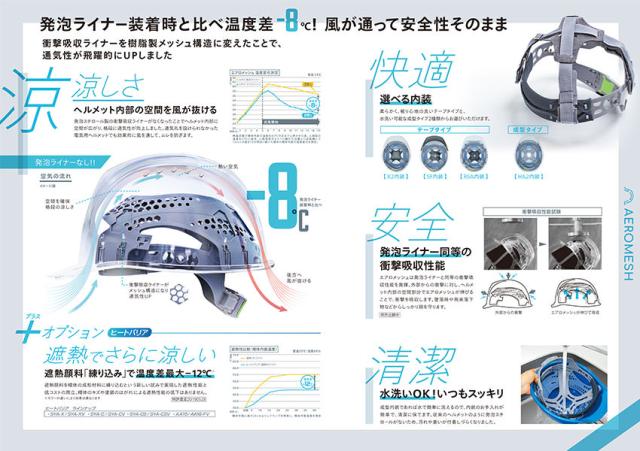 エアロメッシュは発泡ライナーと同等の衝撃吸収性能を発揮。外部からの衝撃に対しヘルメット内部の空間部分でエアロメッシュが伸びることで衝撃を吸収します。墜落時や飛来落下物などからしっかり頭を守ります。