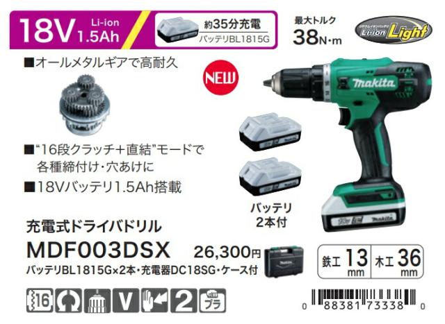 (マキタ) 充電式ドライバドリル MDF003DSX バッテリBL1815Gx2本+充電器DC18SG+ケース付 オールメタルギアで高耐久 鉄工13mm 木工36mm 18V対応 makita
