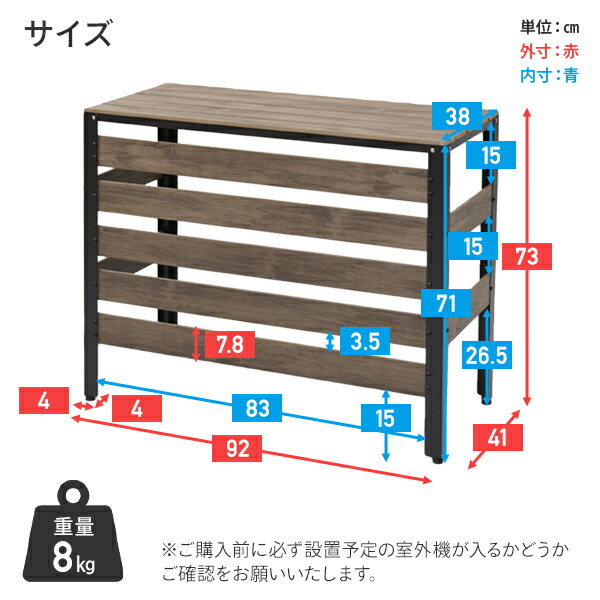 | 本体サイズ | 本体外寸:幅92×奥行41×高さ73cm 重量8kg 室外機収納部内寸:幅83×奥行38×高さ71cm |