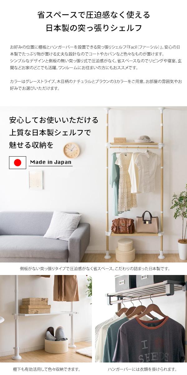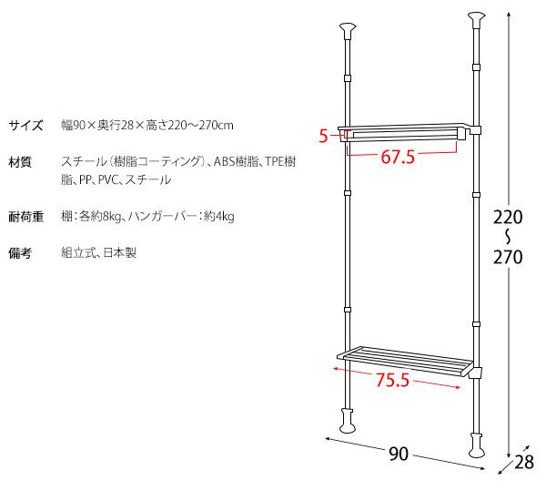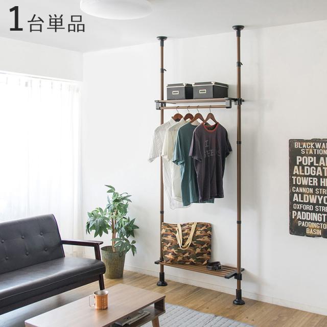 FCL-HR 突っ張りハンガーラック【1台単品】ブラウン色 / 全3色 棚板高さ自由 日本製 幅90×奥行28×高さ220〜270cm 組立て商品 コートハンガー 衣類ハンガー コート掛け 洋服掛け 衣類収納
