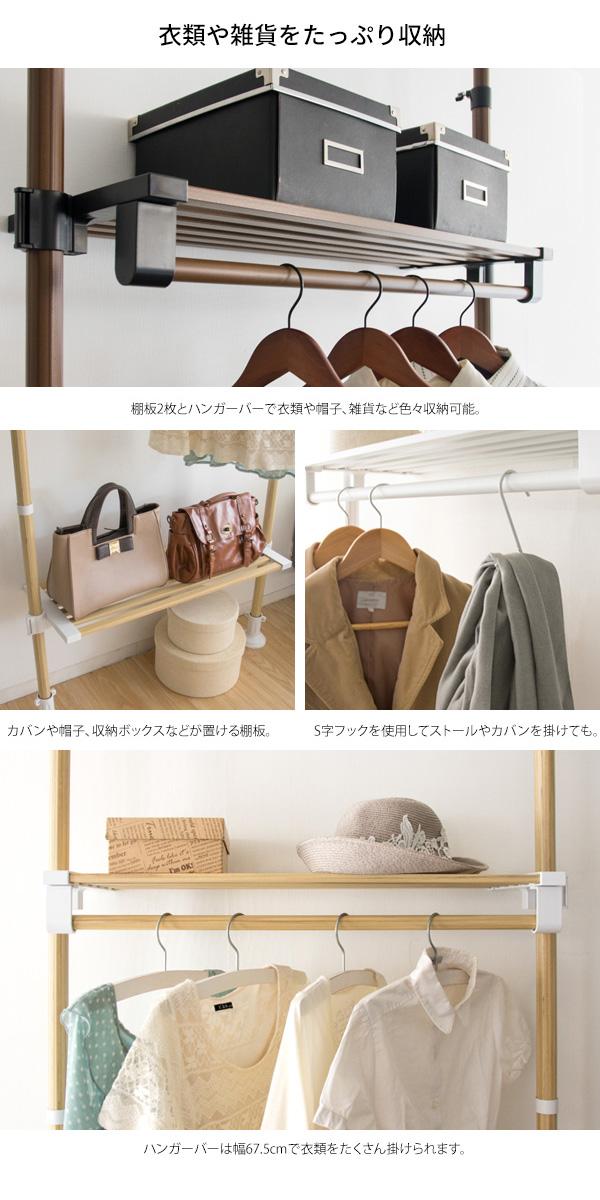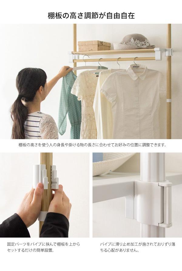 お好みの位置に棚板とハンガーバーを設置できる突っ張りシェルフ。