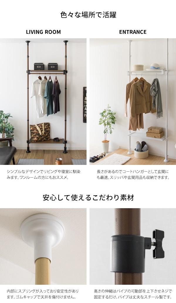 シンプルなデザインと側板の無い突っ張り式で圧迫感がなく、省スペースなのでリビングや寝室、玄関など、お家のどこでも活躍。賃貸住宅やワンルームにお住まいの方にもおススメです。