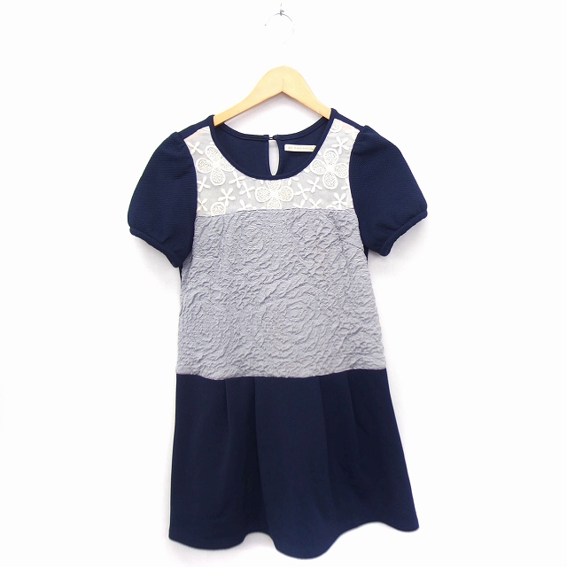 【中古】ビーラディエンス BE RADIANCE ワンピース 素材切替 レース シフォン パフスリーブ 丸首 ひざ丈 F ネイビー 紺