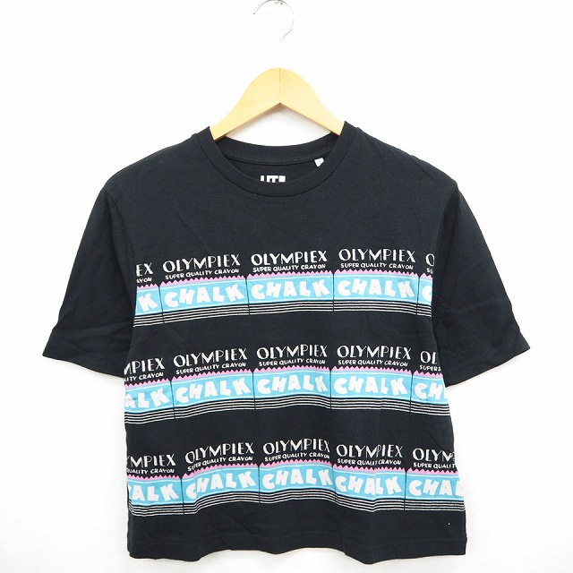 【中古】ユニクロ UNIQLO Tシャツ カットソー 英字 文字プリント 丸首 半袖 コットン 綿 S ブラック グレー 黒 灰 /MT