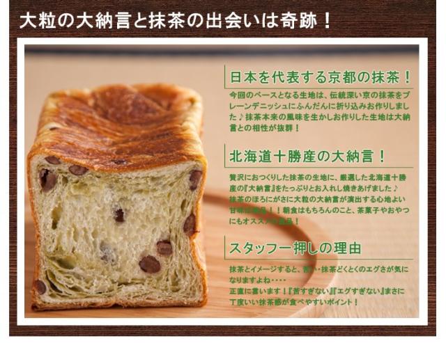 小麦粉(国内製造)、大納言納豆(砂糖、小豆)、ファットスプレッド、抹茶味フラワーペースト(砂糖混合異性化液糖、ショートニング、砂糖、水飴、植物油脂、でん粉、抹茶、その他)、砂糖、マーガリン、油脂加工食品、卵、パン酵母、食塩/加工でん粉、乳化剤、ソルビトール、増粘剤(増粘多糖類、CMC)、香料、着色料(クチナシ、カロチン)、酸化防止剤(V.C、V.E)、ビタミンC、(一部に小麦・卵・乳成分・大豆を含む)