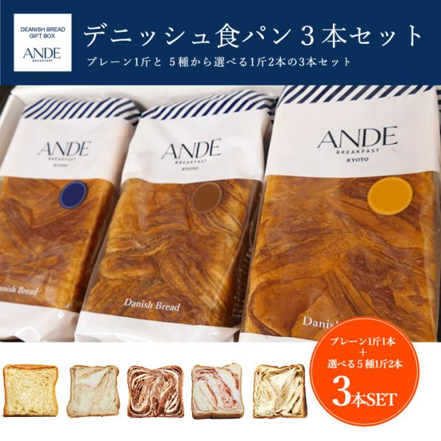デニッシュ 食パン ギフト (ボックス付き) プレーン1斤1本と1斤5種から2本選べる3本セット アンデ