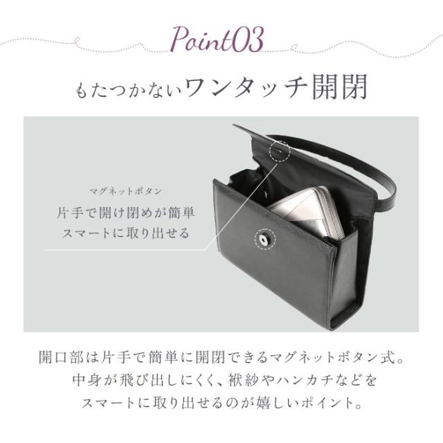 | 商品説明 | ・長く使えて合わせやすい、シンプルなフォルムが魅力的。Silvia Rossiniからフォーマルバッグが新登場。 ・フラップは開け閉めのしやすいマグネット式で、荷物の出し入れがラクラク。 ・お財布・スマートフォン・リップクリーム・ミラー等の必要なアイテムが収納可能。 ・バッグの内側には、小物の整理に便利なオープンポケット×1、ファスナーポケット×1を配置。 ・必要な小物がコンパクトに収まる、絶妙なサイズ感。軽量なので片手で楽々持ち運び。 ・冠婚葬祭などの行事やパーティ、授業参観や入学式など、フォーマルシーンを落ち着いた雰囲気に演出してくれる優秀バッグ。 |