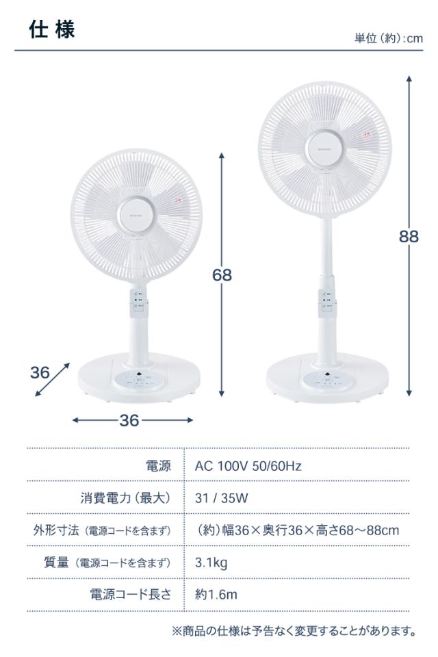 幅約36×奥行約36×高さ約68〜88(電源コード含まず)