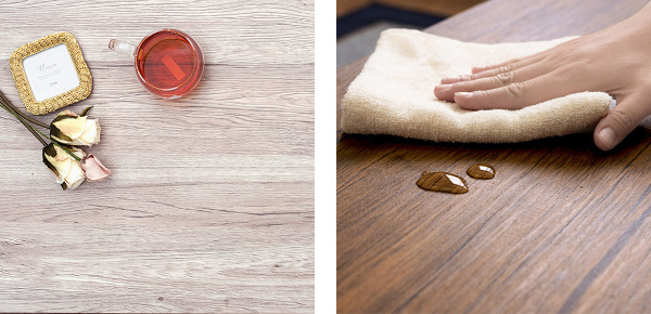 見た目はまるで天然木ですが、木の質感や凸凹感まで再現された木目調のシートが採用されています。こちらのシートは耐水性に優れているので、うっかり飲み物をこぼしても安心です。また傷や汚れが付きにくくシミになりにくいので、使いやすさ抜群です。
