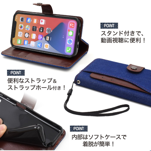 デニムスライドカードポケット手帳型ケース。 背面にもスライド式のカードポケットを搭載!(実用新案登録済) 横にスライドするので、スマホケースで非接触ICカードを使用する際に必要な 「電波干渉防止シート」が必要ありません!!気軽に非接触型ICカードを使用できます。 また、収納式なので逆さにしてもカード落下の心配がなく、カード収納に最適です。 男女どちらでもお使いいただける、スタイリッシュなデニムデザイン。 内側は落ち着いたレザーデザインです。 背面を折り返すとスタンドとして使用できるので、動画視聴に便利です。 落下防止に便利なストラップホール付きです。 横開きタイプなので、手帳のように使うことができます。 しっかりと固定できるスナップボタン式を採用!マグネットタイプではないので クレジットカードなどの磁気カードも収納できます。 | ||||||||||||||